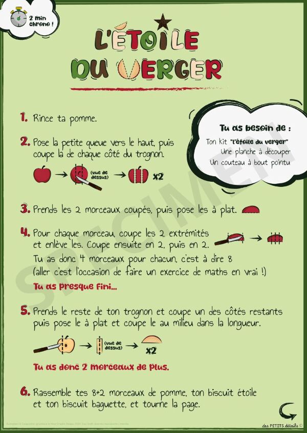 En quelques minutes, l'adulte ou l'enfant qui sait déja lire, peut couper le fruit (ici : la pomme ) selon les indications notées sur le set; puis, l'enfant place les morceaux sur la face recto du set. Accompagnés d'un biscuit sablé, voici un goûter complet et équilibré.
